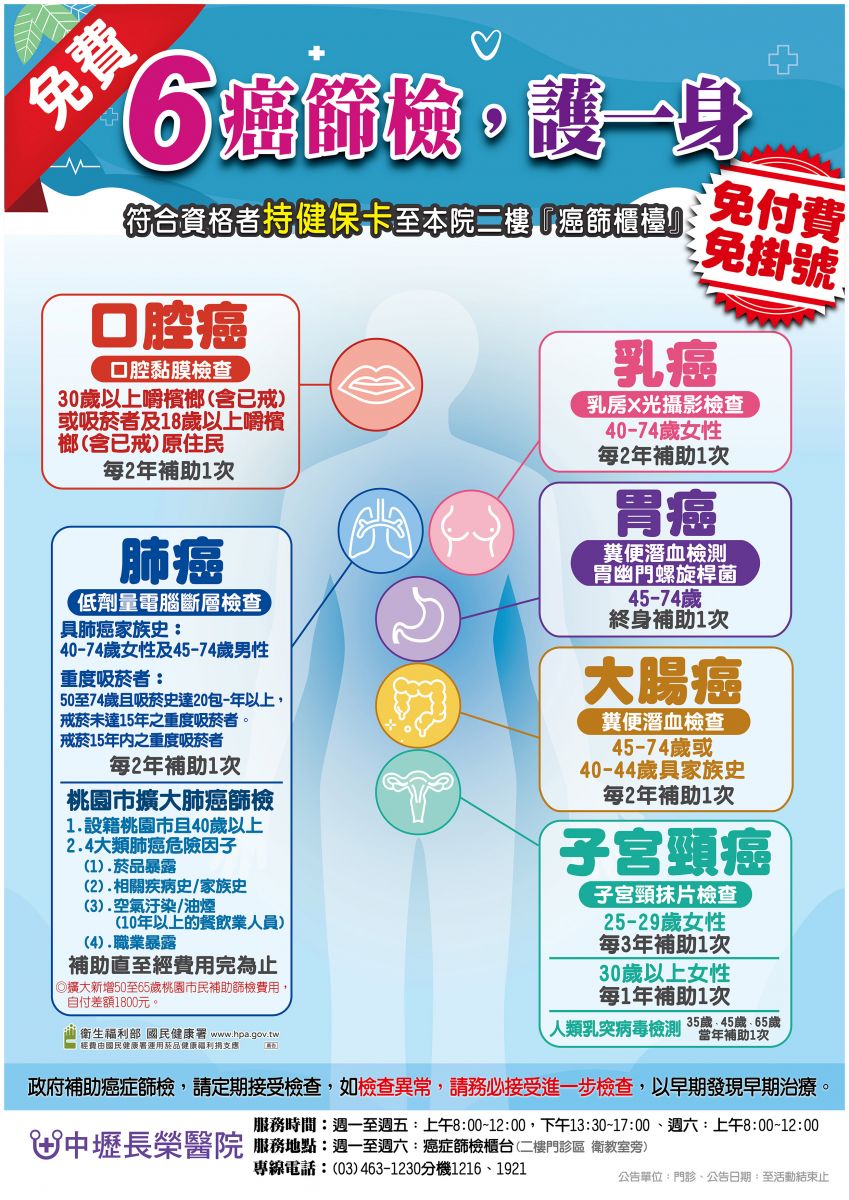 免費癌症篩檢~五癌加碼六癌囉!